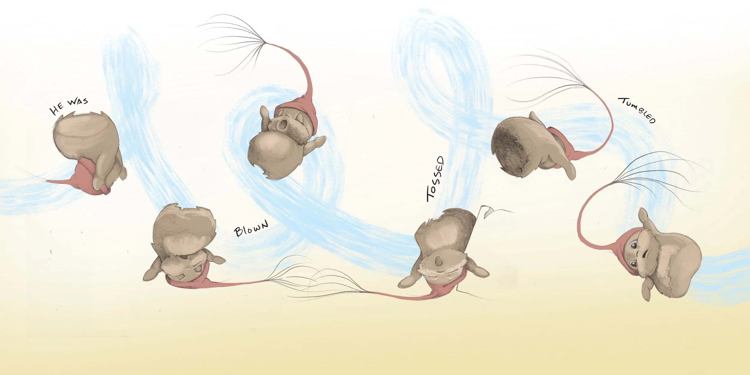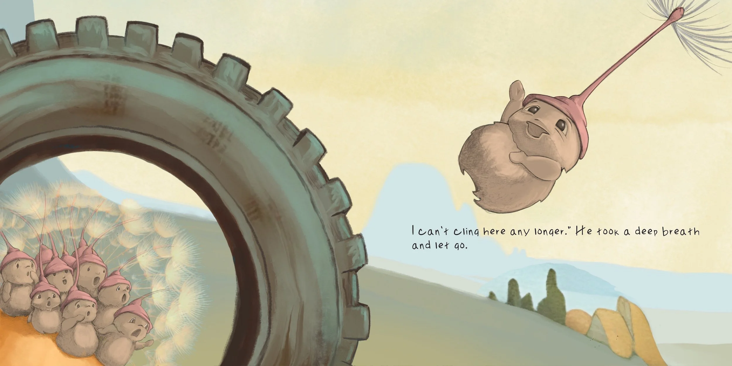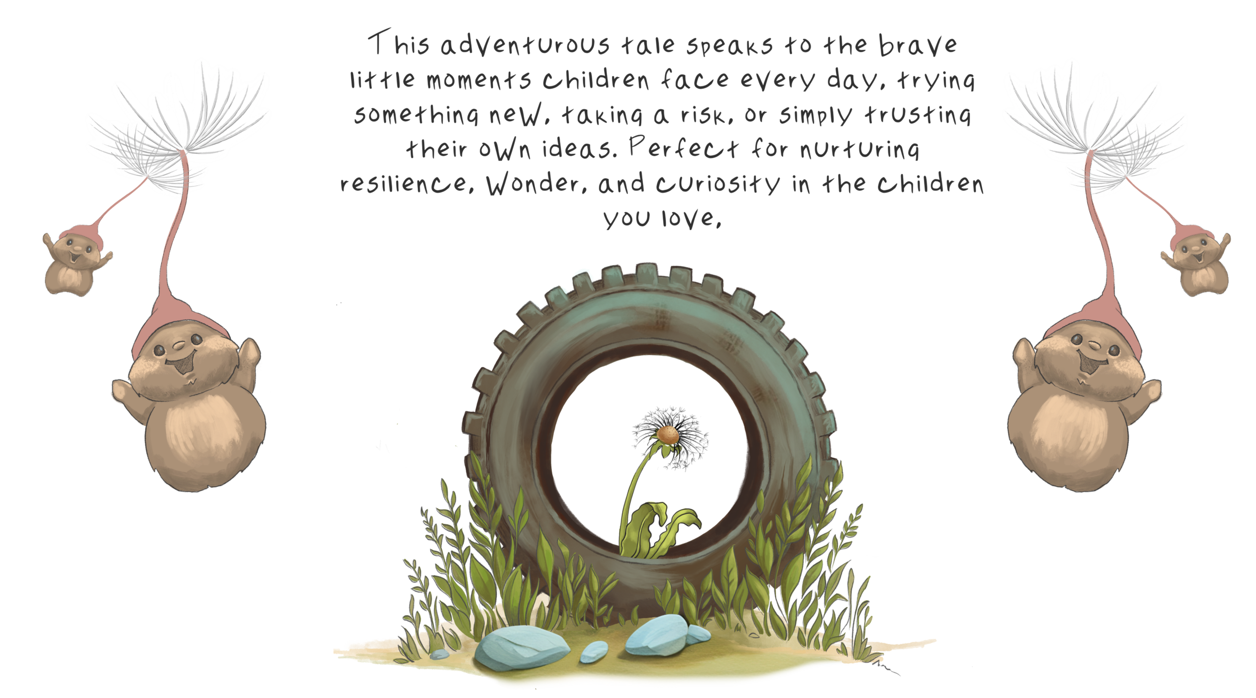 Decorative image with two chubby gnomes hanging from leaves, sitting on the ground, and surrounded by greenery, stones, and a large gear with a flower inside. Handwritten quote at the top about bravery and curiosity.
